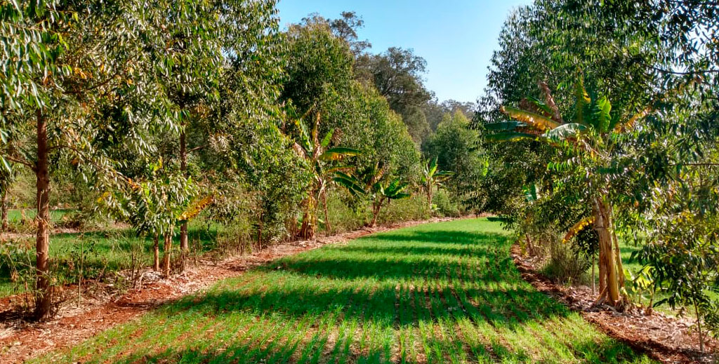 A imagem mostra as linhas e entrelinhas do sistema agroflorestal do Campus Lagoa do Sino